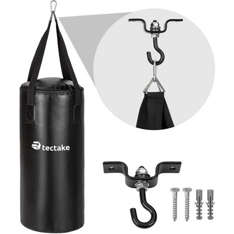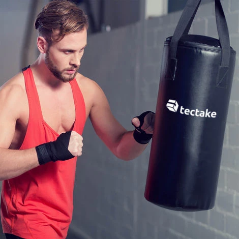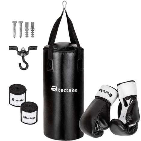 Accessoires de Boxe et de Sport de Combat, 1 Sac de Frappe, 2 Gants de Boxe, 2 Bandages de Protection + Fixation Noir TECTAKE. • Vous voulez vous entraîner chez vous sans aller dans une salle de boxe ?! • Ce kit de boxe est fait pour vous. • Avec ces gants et ce sac de frappe, vous pouvez entraîner votre corps de manière efficace. • Grâce à ce kit de boxe, vous pouvez créer votre programme d’entraînement et vous exercez à l’entraînement fractionné, au shadow-boxing ou encore à l’entraînement d’endurance. • Avec ce sac de boxe, exercez-vous de manière ciblée à différentes techniques de boxe comme le crochet, le cross ou le jab. • L’ensemble se compose d’un sac de frappe lourd de qualité ainsi que d’un crochet pour le fixer au plafond et d’une paire de gants de boxe de taille 6 Oz équipée de larges bandes auto-agrippantes pour un maintien sûr. • Les bandes avec un crochet pour le pouce permettent d’absorber la transpiration des mains et ainsi de prolonger la durée de vie de vos gants. • Cet ensemble de boxe ne prend pas beaucoup de place et vous pouvez le ranger facilement.