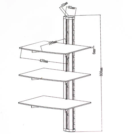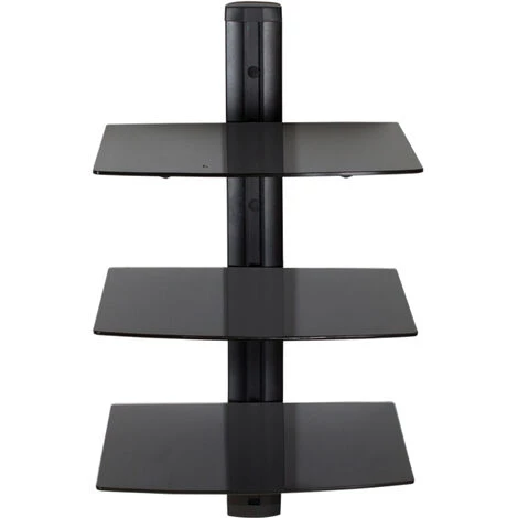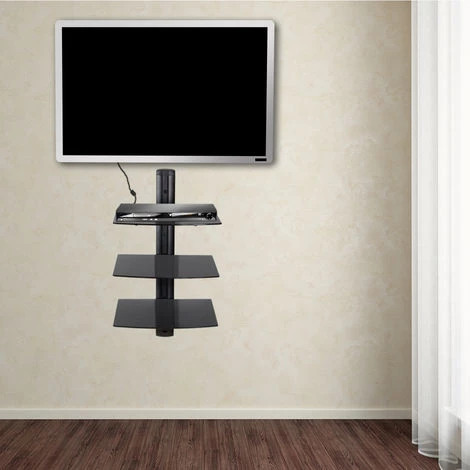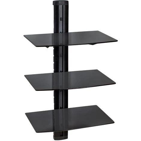 Support Mural, Meuble Mural, 3 Etagères Design Réglable en Verre 80 cm x 42 cm x 33 cm Noir TECTAKE. • Vous êtes à la recherche d’un support pratique pour ranger vos films, DVD, vos télécommandes, vos enceinte, décodeurs et autres petits appareils ? • Alors choisissez cette étagère murale au design moderne. • Réalisée en verre trempé, l’étagère est réglable en hauteur et offre un espace de rangement peu encombrant. • Ce meuble design va moderniser votre salle de séjour. • Grâce au guide-câbles intégré, tous les câbles peuvent être dissimulés dans le support mural. • Le montage est rapide et facile et peut être effectué sur tous les murs. • Aménagez votre pièce en fonction de vos envies grâce à ce meuble mural.