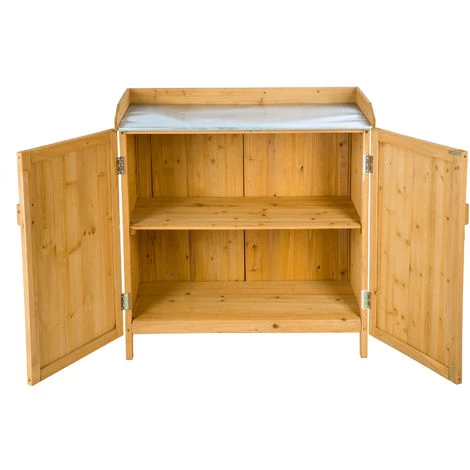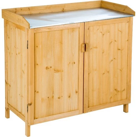 Meuble de Rangement Armoire Commode de Jardin Bas en Bois avec 1 Plateau 98 cm x 48 cm x 95 cm Marron TECTAKE. Vous cherchez un meuble de rangement pratique pour votre jardin, votre terrasse ou votre balcon ?! Dans cette commode, vous pouvez ranger tout votre petit matériel de jardin. Cette armoire basse convient parfaitement comme support pour plantes. Grâce à l’étagère installée dans l’armoire basse, vous pouvez ranger et retrouver facilement tous vos petits outils de jardinage. Le plateau de la commode est doté d’un revêtement en tôle galvanisée et vous permet de faire des travaux de rempotage. Le plan de travail peut être nettoyé facilement. En été, entreposez votre charbon de bois pour barbecue et d’autres ustensiles pour grillades dans cette armoire basse. Vous pouvez préparer vos grillades sur le plateau de votre commode pour les soirées en famille et entre amis.