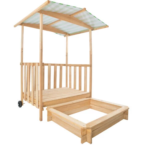 Bac à sable, Cabane de Jardin Enfant avec Toit et Véranda en Bois – 106 cm x 105 cm x 135 cm TECTAKE. Bac à sable en forme de maison. Ce beau bac à sable est le jouet idéal pour vos enfants. Il est équipé d’une véranda couverte qui protège les enfants et parents des rayons du soleil. Grâce aux roues, la véranda peut être poussée sur le bac à sable et protège ainsi le sable contre la pluie ou les animaux.