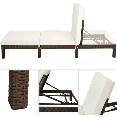 Chaise longue, Transat, Bain de Soleil Réglable en Acier et Résine Tressée – 1 Place – 196 cm x 66 cm x 22 cm TECTAKE. • Avec cette chaise longue en Poly Rotin (Résine Tressée), transformez votre jardin, votre terrasse, votre jardin d’hiver, votre balcon ou votre zone de détente en une oasis de bien être. • Détendez-vous à toute heure de la journée ! • Son design sobre ainsi qu’une association innovante de divers matériaux la rendent élégante. • Ce transat est un véritable attrape regards pour tous les amateurs de soleil. • Le dossier est réglable à 5 hauteurs différentes et peut être ainsi orienté de manière optimale par rapport au soleil. • Le support stable en acier et le poly rotin facile à entretenir conviennent aussi bien pour une utilisation à l’extérieur comme à l’intérieur. • Le coussin confortable et amovible vous apporte un confort de couchage maximal.