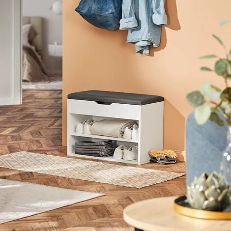 Le porte-chaussures polyvalent de tectake met de l’ordre dans votre couloir – avec élégance. Les deux étagères ouvertes offrent suffisamment d’espace pour six paires de chaussures, tandis que le compartiment rabattable supérieur est idéal pour ranger les foulards, les gants et les chapeaux. Le confort est assuré par le siège rembourré, dont la couleur est parfaitement assortie à la surface de l’étagère. Les panneaux MDF robustes et le revêtement en mélamine confèrent à la construction compacte un haut degré de stabilité et un aspect attrayant qui peut être facilement combiner avec différents styles d’ameublement.