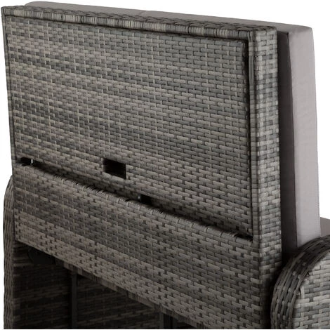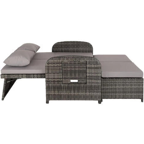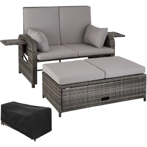 Envie d’un mobilier de jardin multifonctions ? Notre canapé de jardin CRETE tectake vous séduira à coup sûr ! Ce canapé offre 2 confortables places assises, avec une tablette escamotable de part et d’autre pour y déposer votre boisson, livre, téléphone ou télécommande. Pour une ambiance plus détente, sortez la partie inférieure du canapé qui se transforme en repose pied : vous avez alors un large fauteuil relax. Vous en voulez encore plus ? Réglez le dossier sur le degré d’inclinaison de votre choix pour avoir un luxueux bain de soleil. La structure de ce canapé de jardin modulable est en aluminium recouvert de résine tressée. Ce matériau d’apparence similaire au rotin naturel est parfaitement adapté à l’extérieur : vous pouvez l’installer dans votre jardin, sur votre terrasse ou votre balcon sans craindre les intempéries. Le + de notre canapé ? La partie inférieure recèle un coffre pratique pour y ranger les coussins une fois la belle saison passée. Une housse de protection est incluse dans la livraison pour le remisage hivernal.