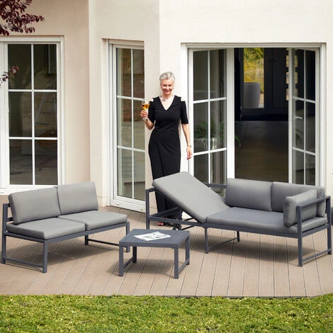 Optez pour la modernité avec notre canapé de jardin FARO 5 places tectake ! Adapté aussi bien pour une utilisation en extérieur (jardin, terrasse, patio, balcon) ou en intérieur (véranda, salon, jardin d’hiver), le cadre en aluminium des canapés et de la table est facile d’entretien. Les housses des coussins confortables sont revêtues d’un traitement hydrofuge. Elles peuvent également se retirer facilement en cas de besoin grâce à la fermeture éclair. Pour une ambiance encore plus lounge et détendue, l’une des banquettes a une fonction chaise longue : réglez le dossier sur 6 différentes positions pour profiter d’un apéritif allongé comme du temps de l’Antiquité. Selon vos besoins les canapés s’agencent soient en grand canapé d’angle, soit en salon de jardin face à face.