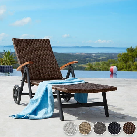 Profitez de votre jardin ou de votre balcon installé/e dans notre bain de soleil à roulettes AUCKLAND tectake. Ce transat de belle allure et à la fois pratique et facile à entretenir grâce à l’assise en résine tressée. Adaptez l’inclinaison du dossier du fauteuil simplement à l’aide des accoudoirs. Vous pouvez donc prendre un bain de soleil, lire ou faire une sieste ! Suivez la course du soleil en déplaçant facilement la chaise avec l’aide des roulettes Une fois la belle saison finie, la chaise longue ne prend que très peu de place : repliez-la et le tour est joué. Un maximum de détente pour très peu de place prise ! La solide structure en aluminium est assez lourde pour ne pas s’envoler lorsque le vent souffle.