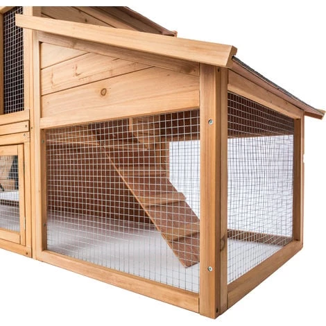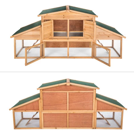 Cage, Poulailler, Clapier à Lapin Hamster, Gerbille, Petits Rongeurs en Bois 226 cm x 77 cm x 95,5 cm Marron TECTAKE. Ce magnifique Clapier / Poulailler allie le côté pratique et fonctionnel. Les petits animaux tels que les lapins, les poules, les canards, mais aussi les cochons d’Inde, les cobayes, les chinchillas s’y sentent parfaitement à l’aise. Ce clapier est pourvu d’un espace libre au sol spacieux (parc), qui permet aux animaux de manger de l’herbe, ainsi que d’une zone de repos protégée en hauteur. Bien sûr, tous ces espaces sont couverts et offrent un maximum de sécurité à vos animaux contre les intempéries mais aussi les prédateurs (Rapaces, Chats ou Renards…). Les zones de repos situés dans la partie supérieure sont accessibles par deux rampes qui permettent à vos animaux de rentrer et sortir facilement. Deux tiroirs à déjection avec fond en zinc simplifie le nettoyage de la partie supérieur. Quatre portes verrouillables individuellement permettent un accès facile.
