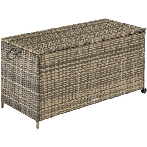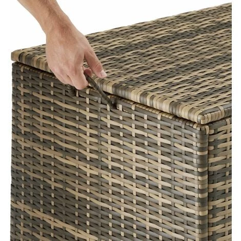 La boîte de rangement polyvalente Kuusamo de tectake combine un grand espace de rangement avec un look attrayant. Le tressage séduisant est réalisé en poly rotin résistant et la structure stable en aluminium inoxydable – une combinaison optimale pour une utilisation en extérieur tout au long de l’année. Le couvercle renforcé doté d’un mécanisme d’ouverture facile dissimule le revêtement intérieur amovible en polyester respirant qui offre une protection supplémentaire contre le vent et les intempéries. Grâce à la poignée pratique en forme de boucle, aux deux roulettes entièrement pivotantes équipées d’un frein de blocage et à son poids léger, le déplacement de cette boîte de rangement fonctionnelle est un véritable jeu d’enfant.