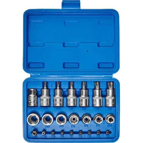 - 7 Clés à douille Torx femelle ½ pouce (E12, E14, E16, E18, E20, E22, E24).