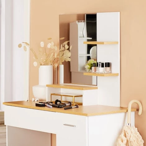 Vous cherchez une coiffeuse moderne pour votre chambre ou votre dressing ? Vous avez trouvĂ© ! Avec son design Ă©purĂ©, cette coiffeuse ira Ă merveille dans votre intĂ©rieur de style scandinave ou contemporain. Elle vous offre un grand miroir pour vos sĂ©ances de maquillage et de coiffure. Tout votre matĂ©riel, accessoires de beautĂ© et parfums trouveront leur place grâce aux nombreux rangements : trois Ă©tagères sur la partie supĂ©rieure + un tiroir compartimentĂ© et un grand placard dans la partie infĂ©rieure. Cette partie peut d’ailleurs servir de bureau si vous le souhaitez. La structure en panneaux agglomĂ©rĂ©s de cette belle coiffeuse est recouverte de mĂ©lamine offrant une surface anti-rayures facile d’entretien.