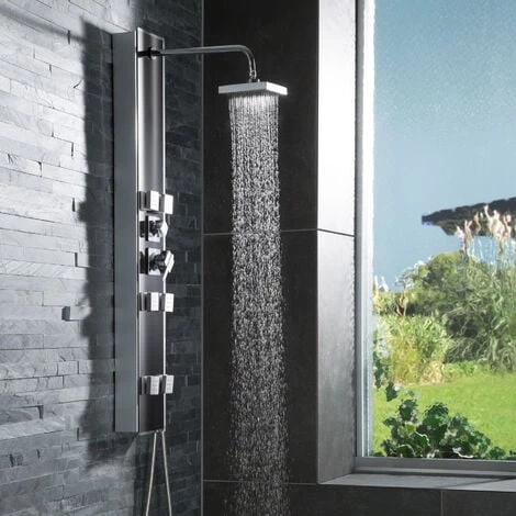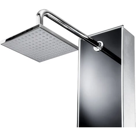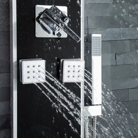 Système Colonne Ensemble de Douche Pluie de Massage avec Douchette, Mitigeur et Pommeau 120 cm x 18 cm x 8.5 cm Noir TECTAKE. Un incontournable dans votre salle de bain ! L’élégante colonne de douche est un ensemble tout en un. Elle comprend un pommeau de douche géant à effet pluie, une douchette flexible dotée d’un tuyau en acier inoxydable et de buses de massage. L’effet de bien-être et de détente est absolument garanti. La particularité de cette colonne de douche luxueuse se trouve dans les trois éléments de sortie d’eau qui peuvent être contrôlés individuellement. Ainsi, prendre une douche se transforme en une expérience de massage unique. Les buses sont auto-détartrantes. Le verre trempé, qui compose la partie frontale, est un matériau particulièrement durable dans les environnements humides. La colonne de douche est facile à installer grâce aux raccords normalisés et à un support.