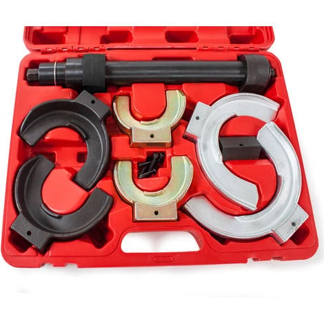 Compresseur de Ressort d’Amortisseurs McPherson avec Ressorts 80 mm à 190 mm Rouge TECTAKE. Auto et Moto Tuning Abaissement Cet outil de qualité professionnelle permet de remplacer de façon simple et fiable paliers d‘amortisseurs, amortisseurs et ressorts. Ce compresseur de ressorts est spécialement construit pour les jambes de force McPherson. Les 3 paires de supports de ressorts interchangeables et l’espaceur fourni permettent d’assurer la mise en tension de ressorts de toutes formes et dimensions courantes. Que vous remplaciez seulement les amortisseurs ou les paliers de jambes de force, ou que vous désiriez surbaisser votre véhicule avec un châssis sportif ou un châssis à ressorts hélicoïdaux réglables, ce kit de qualité professionnelle de compression de ressorts vous permettra de procéder de manière simple et fiable au montage/démontage des ressorts du train de roulement.