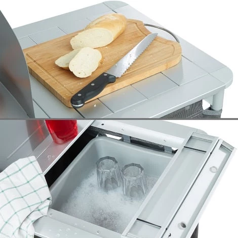 Voici le matériel de camping pratique qu’il vous faut : une cuisine de camping tectake ! Cette cuisine possède un plan de travail avec une protection pratique contre le vent et un évier amovible. Pour une bonne aération, les deux grands compartiments de rangement sont en partie recouverts d’un tissu maillé au dos. La structure robuste en aluminium et les pieds réglables en hauteur rendent ce meuble de camping très stable. Démontée, cette cuisine d’extérieur légère se transporte facilement dans le sac de transport fourni. Optez pour cette cuisine de camping fonctionnelle qui vous accompagne dans tous vos voyages, au camping, en randonnée, en excursion, au camp ou au bivouac.