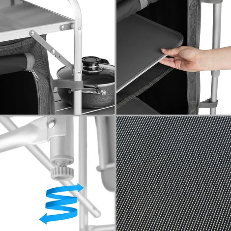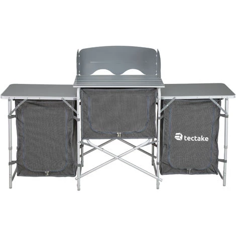 Combinez le confort de votre maison avec le caractère romantique du feu de camp avec notre cuisine de camping tectake ! Montée en quelques instants, notre cuisine d’extérieur vous permet de préparer un repas ou un pique-nique devant votre tente ou sous l’auvent de votre camping-car. Grâce à ce mobilier de camping, vous pourrez cuisiner où vous voulez. Les pieds sont réglables et s’adaptent aux irrégularités du terrain sur lequel vous avez planté votre bivouac. Le plan de travail résistant à la chaleur peut accueillir votre réchaud. Il est doté d’une protection pratique contre le vent. Notre cuisine de camping offre un grand espace de rangement pour votre vaisselle et vos ustensiles de cuisine. Ses 3 compartiments se ferment à l’aide d’une fermeture éclair pour éviter l’intrusion d’insectes et autres petits animaux. Profitez de vos vacances en camping au maximum avec notre mobilier de camping tectake !