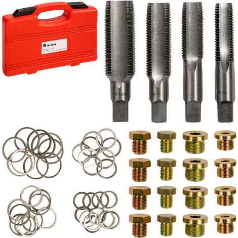 Coffret, Kit de Réparation de Filetage des Boîtes de Vitesse et Carters avec 20 Bouchons de Vidange M13, M15, M17 et M20 TECTAKE. • Grâce à notre kit de réparation, réparez rapidement et facilement les filetages des carters et des boîtes de vitesse de votre véhicule. • Le kit de réparation comprend des tarauds, des bagues d’étanchéité et des bouchons de vidange de tailles M13, M15, M17 et M20. • Les pièces incluses dans la livraison ne sont pas uniquement compatibles avec les voitures mais aussi avec d’autres véhicules. • Le kit de réparation complet est livré dans une mallette en plastique organisée et pratique.