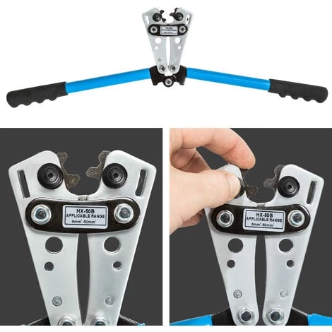 Pince à sertir, Pince Électricien, Outil de sertissage pour Câble Cuivre Aluminium de 6 à 50 mm² TECTAKE. Cet outil de sertissage est adapté en tant qu’outil de presse de cosses tubulaires et de câbles de terminaisons. Les différentes mâchoires sous la forme de disques profilés intégrés en acier trempés peuvent être ajustées en les tournants simplement. Le bénéfice réel est un gain de temps non négligeable car l’échange de matrices n’est pas nécessaire et vous disposez de tous les éléments à portée de main.