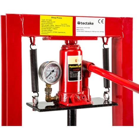 Presse d’Atelier Hydraulique 6 T 4 Niveaux de Réglage TECTAKE. • Réalisez tous vos Travaux d’Assemblage et de Réparation en un Tour de Main et Sans Effort avec cette Presse d’Atelier Hydraulique TECTAKE ! • Son Cylindre Hydraulique permet d’exercer une Grande Pression contrôlable facilement grâce à son Manomètre Intégré. • La Hauteur de Travail réglable sur 4 Niveaux permet de s’adapter à toutes les Situations. • Idéal pour l’Agriculture, l’Atelier, le Garage, l’Industrie, etc.