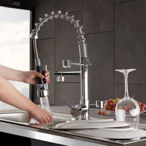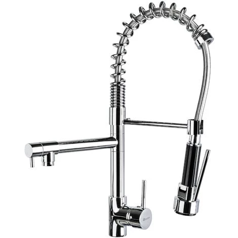 Mitigeur de Cuisine Robinet à Ressort et 1 Douchette Pivotant Design en Laiton Chromé 24,5 cm x 50 cm x 52 cm Gris TECTAKE. Vous rêvez d’une cuisine moderne ? Votre rêve devient réalité grâce à ce mitigeur. Ce robinet de cuisine se compose d’un robinet / douchette avec mitigeur mono-commande. Le mitigeur de cuisine est équipé de cartouches en céramique innovantes. Le premier mitigeur «une main» est très précis, il permet un réglage du débit et de la température de l’eau à souhait. Le deuxième mitigeur vous permet de remplir l’évier en un seul geste. La douchette extractible et le tuyau flexible vous permettent d’atteindre chaque recoin de l’évier et de nettoyer des casseroles en profondeur. Les buses de la douchette sont anti calcaire. Avec sa fonction pivotante à 360°, faire la vaisselle devient un plaisir. Il est réalisé en laiton chromé facile à entretenir. Les 2 tuyaux de raccordement standard, inclus dans la livraison, permettent une installation simple et rapide.