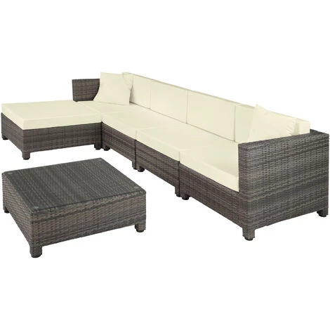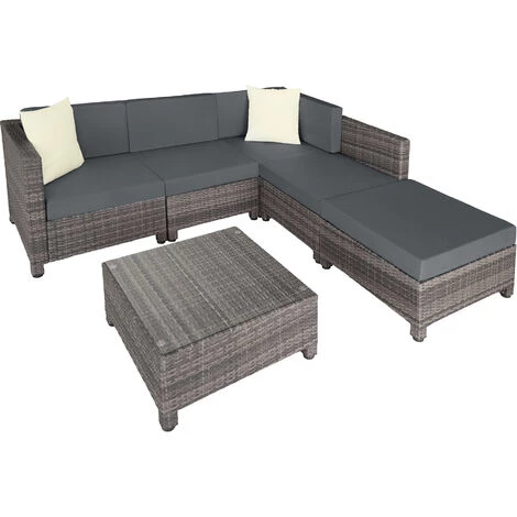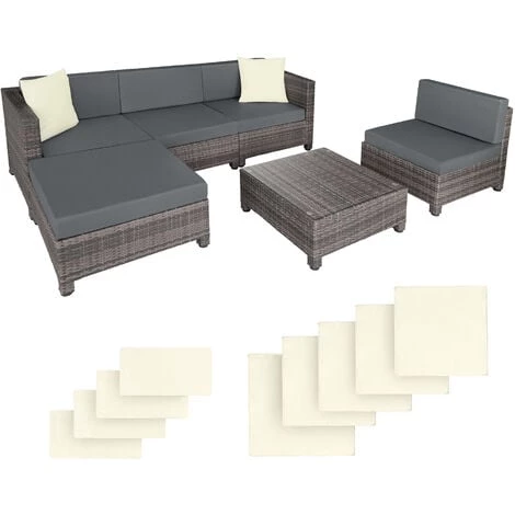 Salon de jardin AMY – 4 Chaises Fauteuils, 1 Table et 1 Tabouret en Résine Tressée structure Aluminium TECTAKE + 2 Sets de housses + 2 Coussins. Salon de jardin en résine tressée « POLY ROTIN » de qualité et d’un design modern. Ses fauteuils confortables et sa table élégante invitent à des moments agréables. Idéal pour recevoir ses amis en intérieur ou extérieur dans une ambiance conviviale et chaleureuse. Conçu pour une utilisation dans le jardin, sur la terrasse ou sous la véranda.