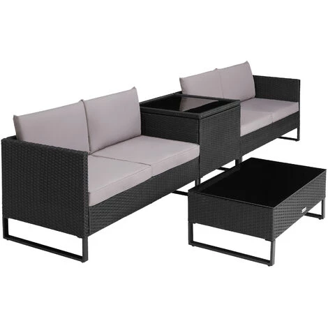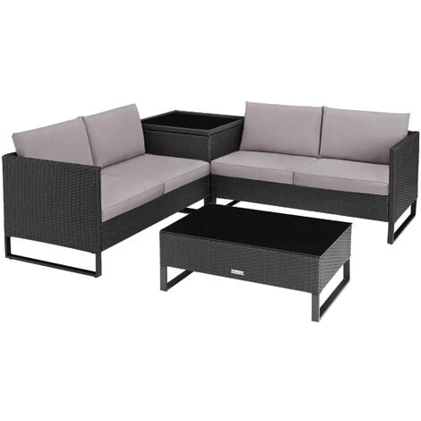 Façonnez votre propre oasis de détente avec le salon en rotin Ostuni confortable de tectake. Les épais coussins d’assise et de dossier épousent la forme du corps et rendent un niveau de confort remarquable. Les coussins d´assise se rangent facilement dans le grand coffre de rangement après utilisation. Avec son élégant plateau en verre trempé noir, la table basse représente le point central de ce salon facile d’entretien. Le support en acier revêtu par poudre et la résine tressée résistante offrent à cet ensemble de quatre meubles une extrême robustesse et une grande résistance. Le superbe salon en rotin Ostuni de tectake, la garantie du bien-être et de l’harmonie.