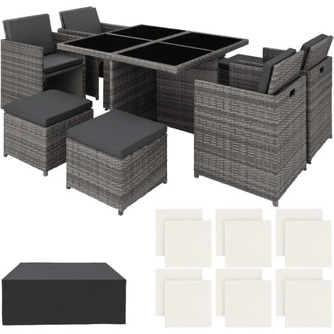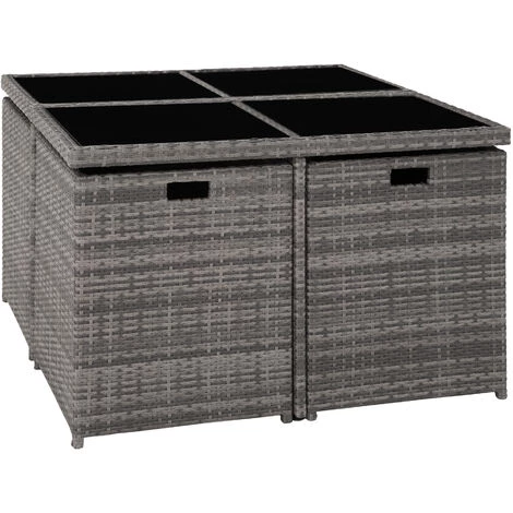 Profitez l’été en famille ou entre amis autour de notre salon de jardin MANHATTAN 8 places ! Notre mobilier de jardin en résine tressée offre des places ultra confortables pour 4 personnes avec repose pieds, ou bien pour 8 en utilisant les tabourets ! Ce salon de jardin encastrable est pratique d’utilisation car ses les dossiers rabattables des fauteuils viennent se glisser entièrement sous la table, avec les tabourets. Une fois replié, l’ensemble de jardin ne prend qu’un minimum de place : idéal pour le remisage hivernal. Sa taille compacte lui permet de trouver sa place aussi bien sur la terrasse dans votre jardin, que sur un balcon en appartement. Son tissage en résine tressée d’apparence similaire au rotin naturel fait de ce meuble un excellent mobilier d’intérieur pour votre salon, véranda ou jardin d’hiver. En plus d’être résolument tendance et design, la résine tressée est un matériau robuste et facile d’entretien : un chiffon humide ou une éponge permet de faire disparaitre les traces de pluie ou de poussière. Les coussins d’assise ont une housse hydrofuge amovible lavable. Pour une durée de vie prolongée, une housse de protection est livrée avec le salon de jardin. Envie de changer ? 2 sets de housses pour les coussins sont inclus. Optez pour le beige ou le gris selon vos envies !