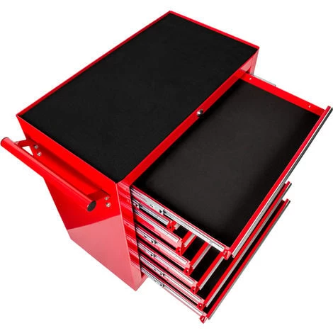Servante d’Atelier Chariot à Outils avec 7 Tiroirs 69 cm x 33 cm x 79 cm TECTAKE. Voici le compagnon idéal de votre atelier ! Vous pouvez y ranger chaque outil à sa place et le retrouver facilement ! Le chariot à outils dispose de 7 tiroirs spacieux, verrouillables et montés sur des glissières à billes. Qu’il soit utilisé dans un atelier professionnel ou pour du bricolage, ce système de rangement vous est toujours utile. La serrure empêche l’ouverture des tiroirs pendant un trajet et protège contre tout accès non autorisé. Les tiroirs et le plateau de ce chariot revêtu par poudre sont équipés de tapis antidérapants. 4 Roues stables facilitent les manœuvres et permettent une utilisation mobile.