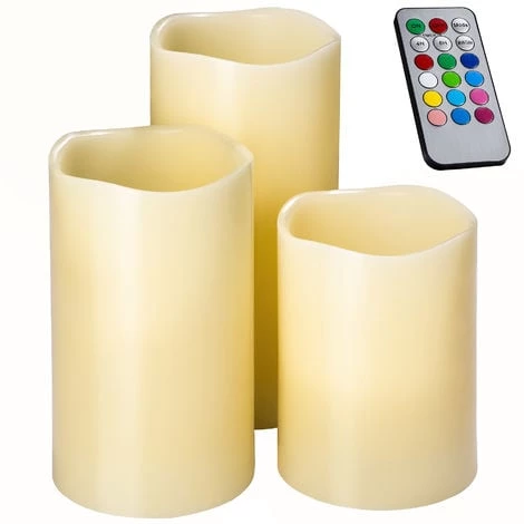Ensemble, Lot, Set de 3 Bougies à LED d’Ambiance sans Flamme de Couleur Changeante en Cire Véritable + 1 Télécommande TECTAKE. • Illuminez votre maison et détendez-vous dans une ambiance chaleureuse avec ces bougies à LED de couleur changeante. • Ces merveilleuses bougies LED créent une atmosphère agréable dans chaque pièce, sans le moindre danger d’incendie ni de salissures causées par la cire fondue. • Ces bougies à LED sont idéales pour vos soirées, vos dîners aux chandelles ou pour vos détentes quotidiennes. • Elles conviennent aussi pour les restaurants, les hôtels, les mariages et les fêtes. • Ces bougies possèdent 12 variantes de couleurs, un mode changement de couleur, un mode lumière vacillante et continue, 2 réglages de minuterie, une portée de la télécommande de 4 m.