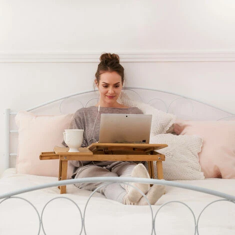 Table de lit pour ordinateur Portable, Tablette, Liseuse en bambou réglable en hauteur inclinable et pliable 55 cm x 35 cm x 26 cm + USB Ventilateur TECTAKE. Cette table de lit pour ordinateur portable facilite votre journée de travail et augmente la qualité de votre temps de loisirs. Ainsi, vous pouvez travailler, consulter internet, jouer ou discuter confortablement dans votre lit. La surface de travail est inclinable et toute la table est réglable en hauteur, afin que vous puissiez la mettre en place individuellement suivant la posture souhaitée. Notre table laquée est en bois de bambou à la fois robuste et élégant. Une caractéristique supplémentaire : cette table de lit est dotée d’un double ventilateur avec port USB. Cette table de lit dispose en plus d’un tiroir latéral dans lequel vous pouvez ranger : Des clés USB ou des cartes mémoire pour les avoir toujours à portée de main.