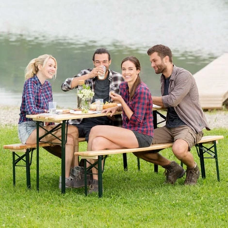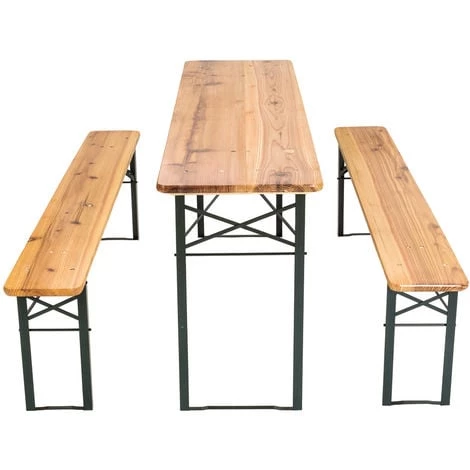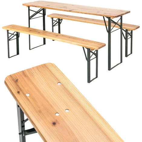 Table et bancs pliant en bois, Table de Jardin, Table de Réception, Table de Camping TECTAKE. Qu’il s’agisse d’anniversaires, de fêtes d’associations ou d’autres événements, l’ensemble robuste pour chapiteau invite dans tous les cas à se rassembler pour un moment agréable. L’ensemble peut se monter et se démonter en un temps record, il est facile à transporter et à ranger.
